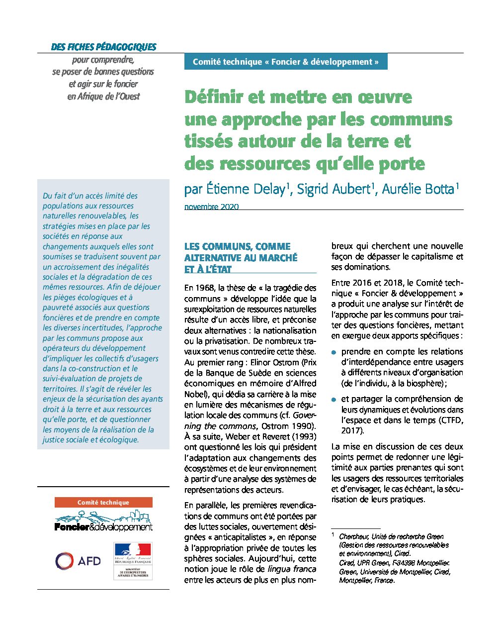 Du fait d’un accès limité des populations aux ressources naturelles renouvelables, les stratégies mises en place par les sociétés en réponse aux changements auxquels elles sont soumises se traduisent souvent par un accroissement des inégalités sociales et la dégradation de ces mêmes ressources. Afin de déjouer les pièges écologiques et à pauvreté associés aux questions foncières et de prendre en compte les diverses incertitudes, l’approche par les communs propose aux opérateurs du développement d’impliquer les collectifs d’usagers dans la co-construction et le suivi-évaluation de projets de territoires. Il s’agit de révéler les enjeux de la sécurisation des ayants droit à la terre et aux ressources qu’elle porte, et de questionner les moyens de la réalisation de la justice sociale et écologique.