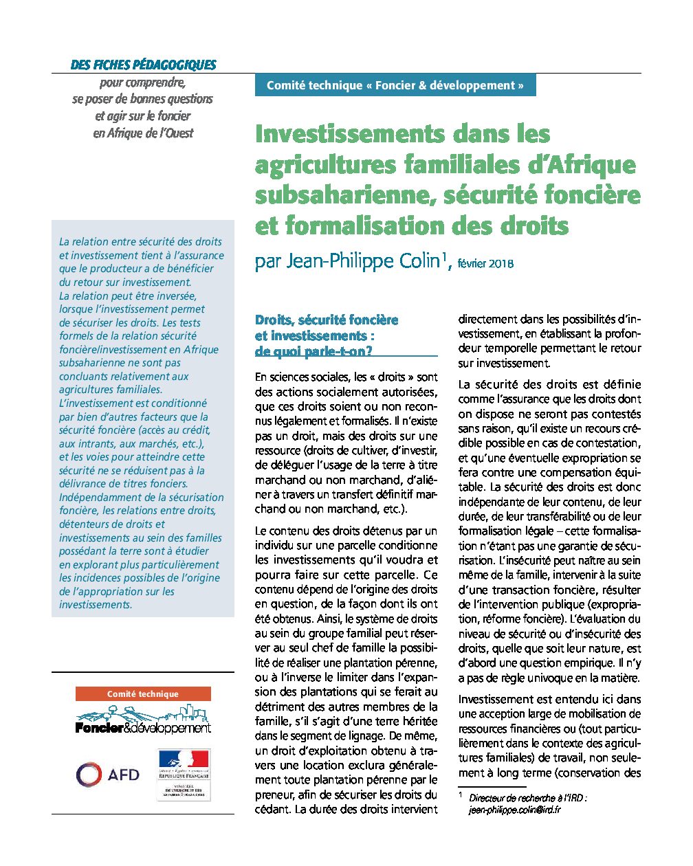 La relation entre sécurité des droits et investissement tient à l’assurance que le producteur a de bénéficier du retour sur investissement. La relation peut être inversée, lorsque l’investissement permet de sécuriser les droits. Les tests formels de la relation sécurité foncière/investissement en Afrique subsaharienne ne sont pas concluants relativement aux agricultures familiales.