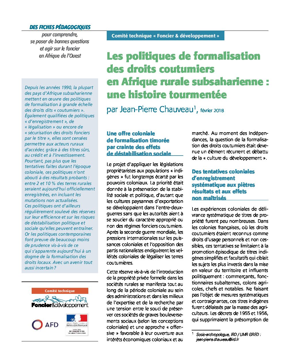 Depuis les années 1990, la plupart des pays d’Afrique subsaharienne mettent en oeuvre des politiques de formalisation à grande échelle des droits dits « coutumiers ». Également qualifiées de politiques « d’enregistrement », de « légalisation » ou encore de « sécurisation des droits fonciers par le titre », elles sont censées permettre aux acteurs ruraux d’accéder, grâce à des titres sûrs, au crédit et à l’investissement.
