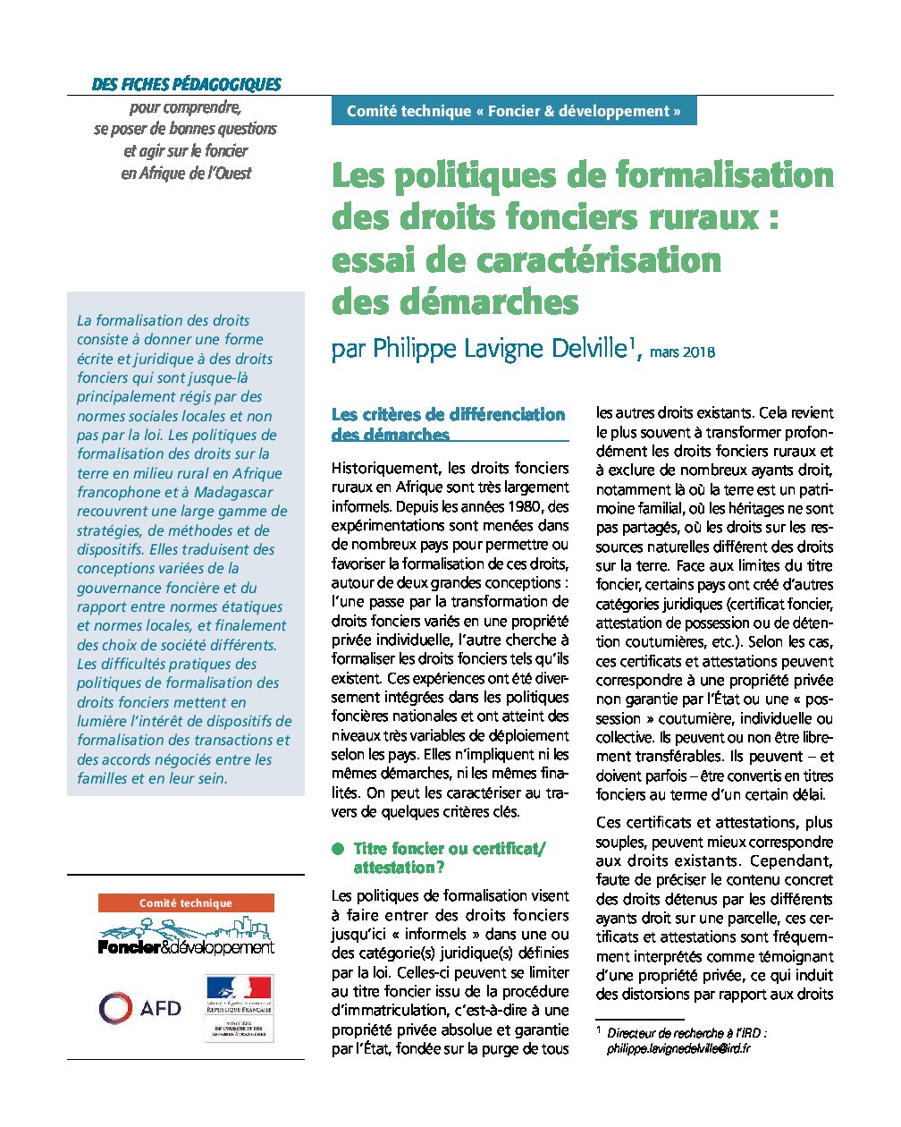 La formalisation des droits consiste à donner une forme écrite et juridique à des droits fonciers qui sont jusque-là principalement régis par des normes sociales locales et non pas par la loi. Les politiques de formalisation des droits sur la terre en milieu rural en Afrique francophone et à Madagascar recouvrent une large gamme de stratégies, de méthodes et de dispositifs. Elles traduisent des conceptions variées de la gouvernance foncière et du rapport entre normes étatiques et normes locales, et finalement des choix de société différents.