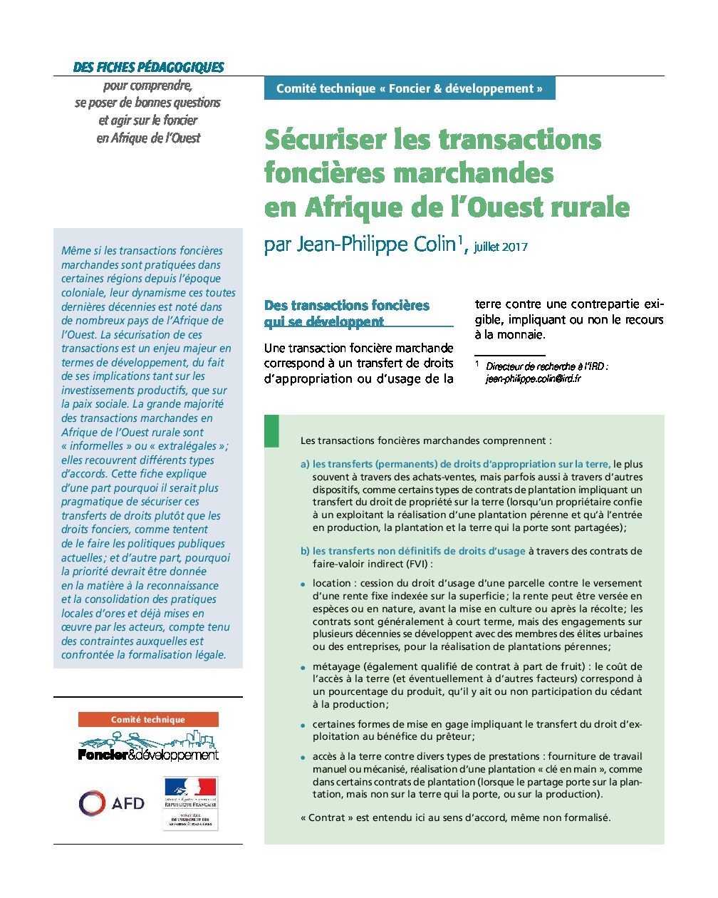 Même si les transactions foncières marchandes sont pratiquées dans certaines régions depuis l’époque coloniale, leur dynamisme ces toutes dernières décennies est noté dans de nombreux pays de l’Afrique de l’Ouest. La sécurisation de ces transactions est un enjeu majeur en termes de développement, du fait de ses implications tant sur les investissements productifs, que sur la paix sociale. La grande majorité des transactions marchandes en Afrique de l’Ouest rurale sont « informelles » ou « extralégales » , elles recouvrent différents types d’accords.